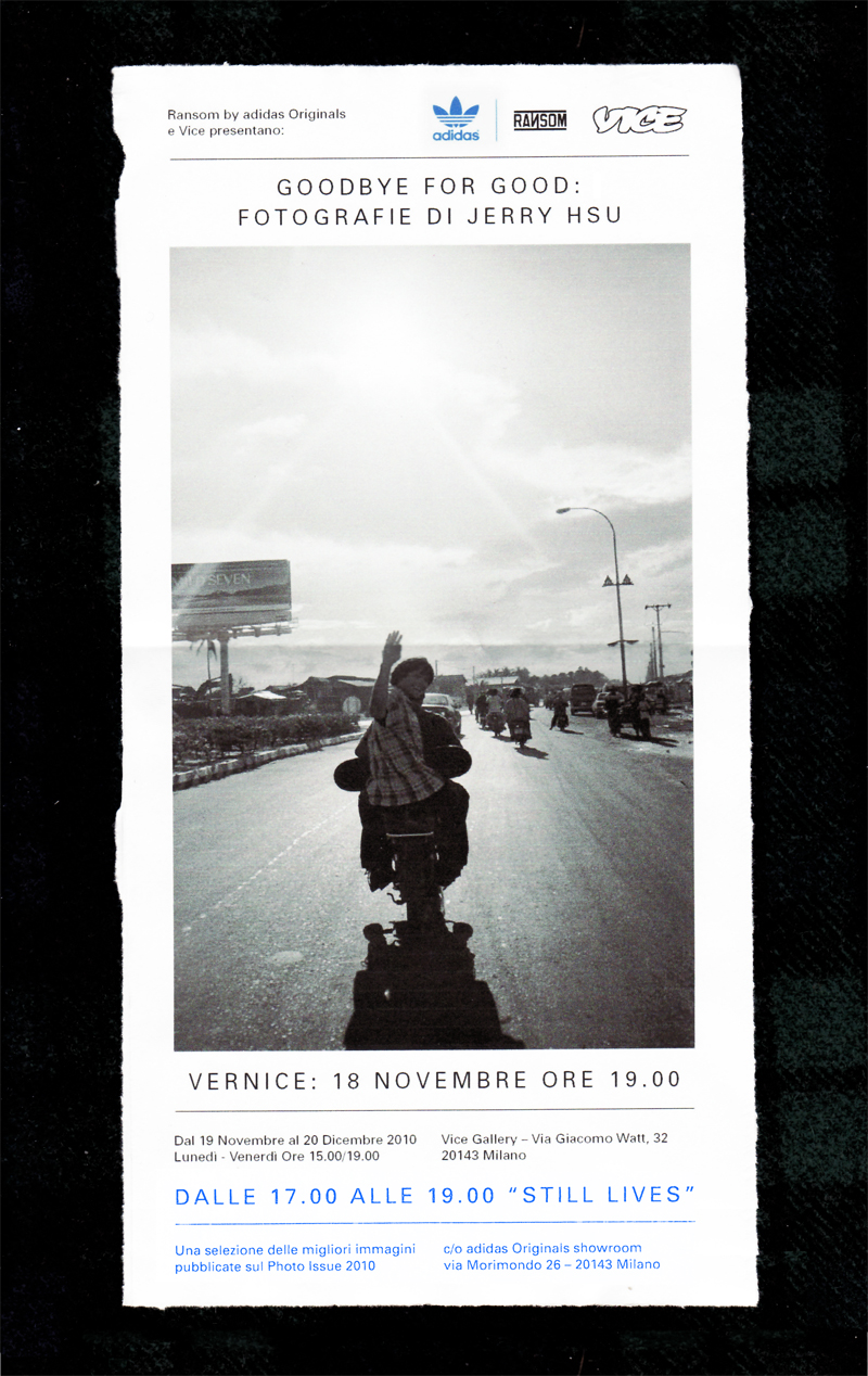 Ransom by adidas Originals e Vice presentano al pubblico italiano la prima personale extra-americana di Jerry Hsu, un giovane talento californiano di origini taiwanesi, che continua a sorprendere e incuriosire il suo pubblico con una fotografia intima e divertente.