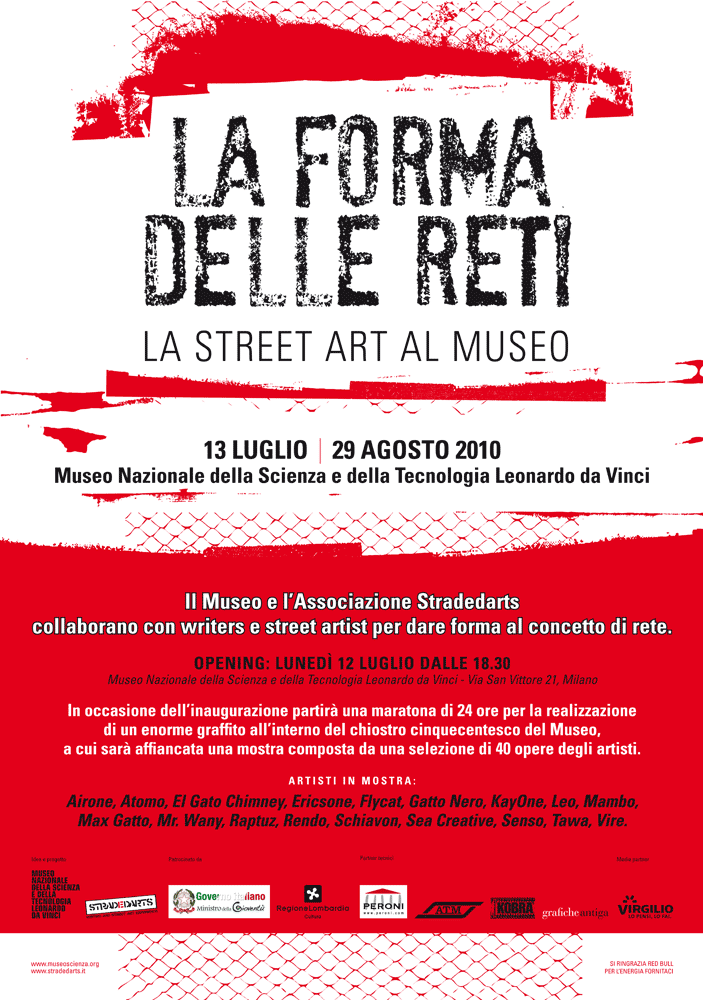 In occasione dell’inaugurazione partirà una maratona di 24 ore, per la realizzazione di un enorme graffito nel chiostro cinquecentesco del Museo. Museo, sì, quello della Scienza e della Tecnologia di Milano, che per tutta l’estate apre le sue porte alla Street Art per la mostra La forma delle reti.